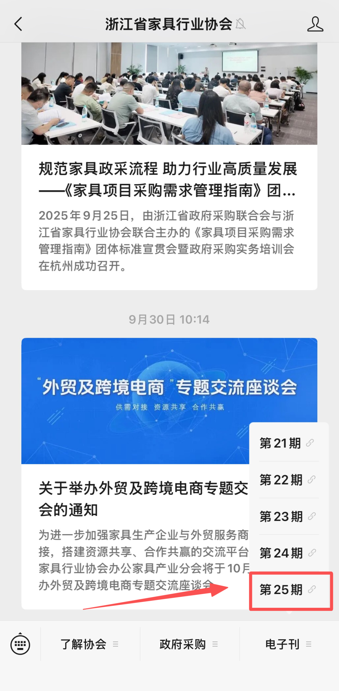 打开手机微信,找到“浙江省家具行业协会”微信公众号,点击左下角菜单“电子会刊”,可跳转到《浙江家具》电子刊页面。(详见下图)