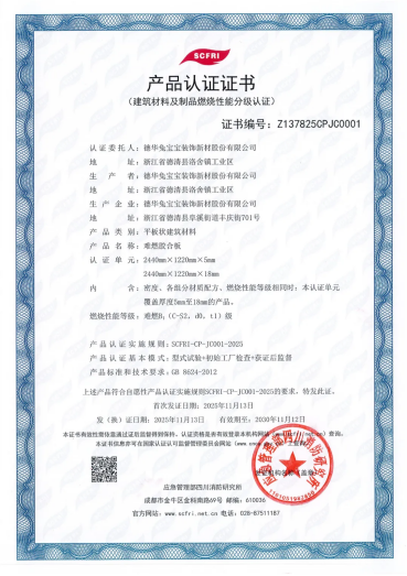 11月13日,兔宝宝难燃胶合板获得应急管理部四川消防研究所颁发的行业首张“建筑材料及制品燃烧性能分级认证”难燃B1级证书,彰显其在燃烧安全性能领域的卓越实力。