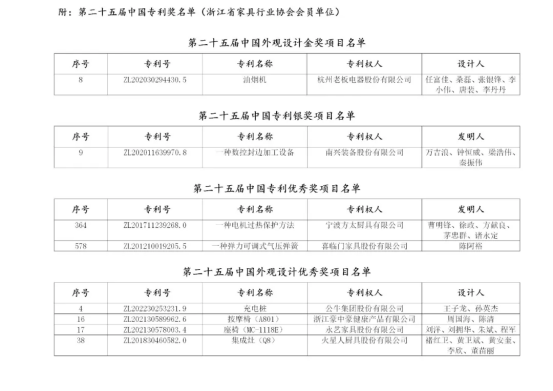 6月5日,国家知识产权局发布第二十五届中国专利奖授奖决定,浙江省家具行业协会8家会员企业获奖,分别为杭州老板电器股份有限公司、南兴装备股份有限公司、宁波方太厨具有限公司、喜临门家具股份有限公司、公牛集团股份有限公司、浙江豪中豪健康产品有限公司、永艺家居股份有限公司、火星人厨具股份有限公司,涵盖外观设计金奖、专利银奖、专利优秀奖、外观设计优秀奖等荣誉。