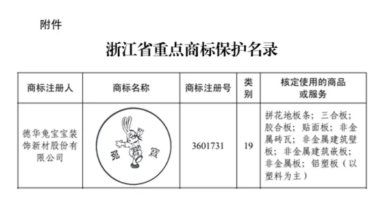 10月,浙江省市场监督管理局(浙江省知识产权局)依据《浙江省知识产权保护和促进条例》及《浙江省重点商标保护名录管理办法》,将“兔宝宝”商标正式纳入“浙江省重点商标保护名录”;同月,兔宝宝桉芯板凭借对孕婴家庭及高环保需求场景的精准适配,在2025年度沸腾质量测评中斩获“孕婴优选除醛抗菌板质量金奖”。