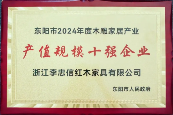 7月3日,东阳市人民政府主办2024年度木雕家居产业“十强企业”颁奖典礼,浙江李忠信红木家具有限公司获评“产值规模十强企业”。