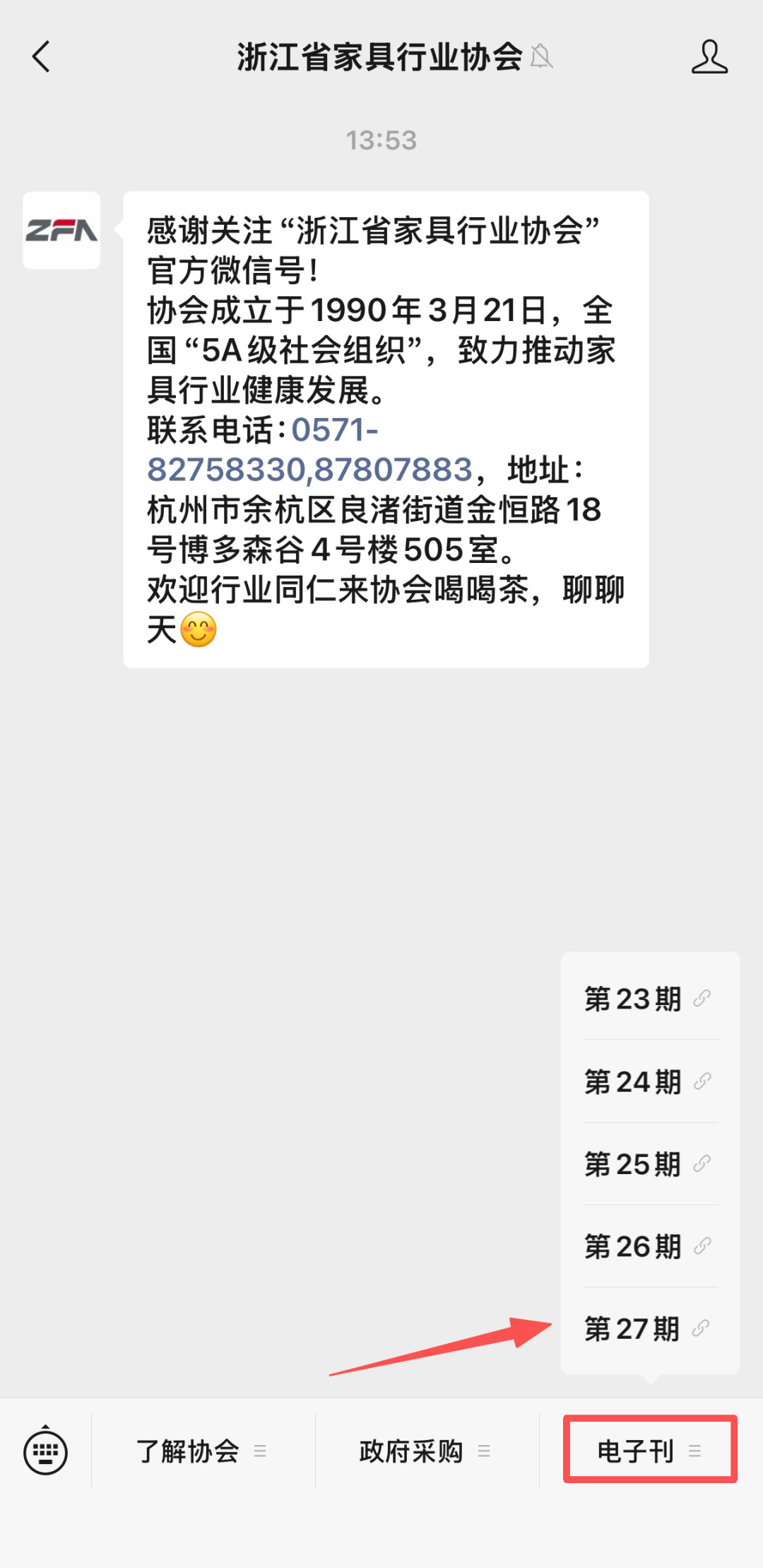 打开手机微信,找到“浙江省家具行业协会”微信公众号,点击左下角菜单“电子会刊”,可跳转到《浙江家具》电子刊页面。(详见下图)